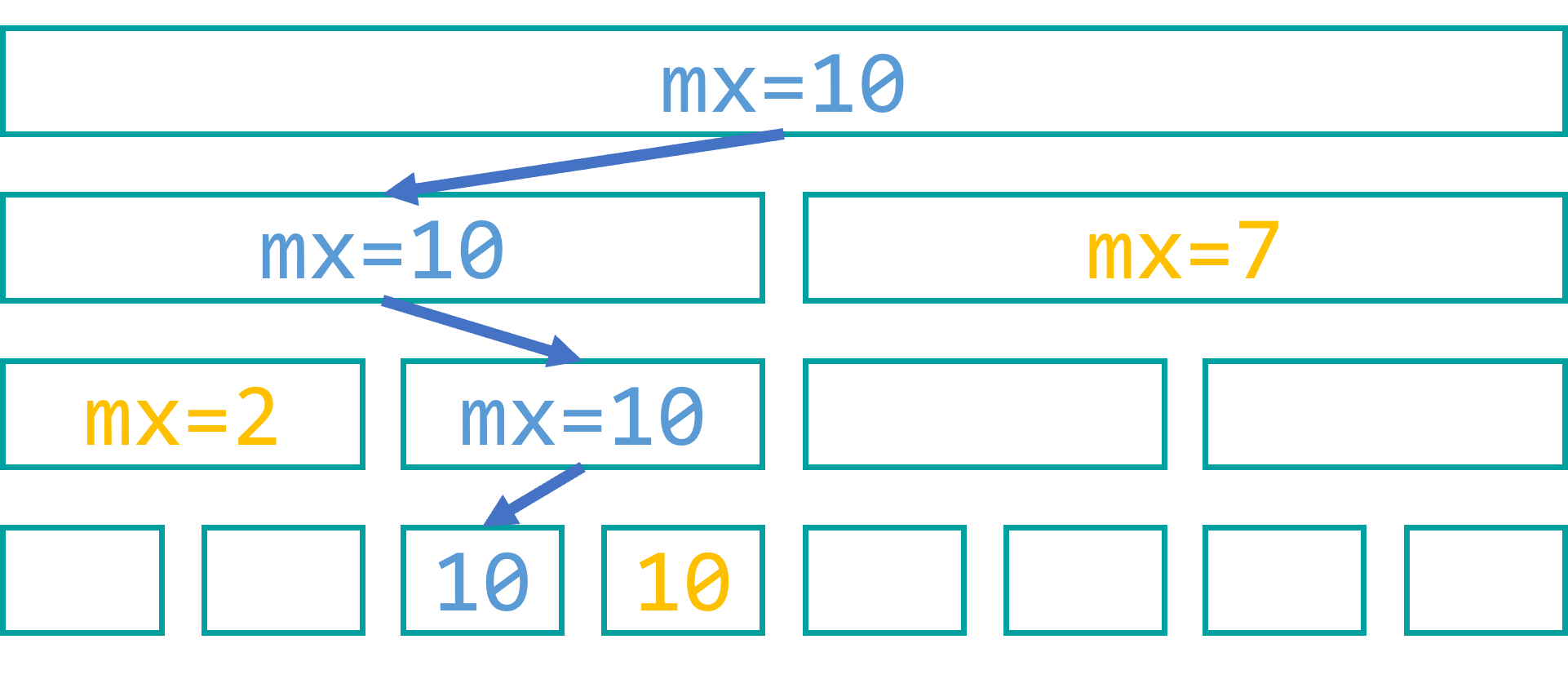但是如果查询区间不是 \([1,n]\),而是任意区间 \([l,r]\),我们就可以把 \([l,r]\) 拆成 \(O(\log n)\) 段线段树上的区间,按从左向右的顺序依次遍历所有区间,找到第一个 \(mx[p]\ge v_0\) 的区间: