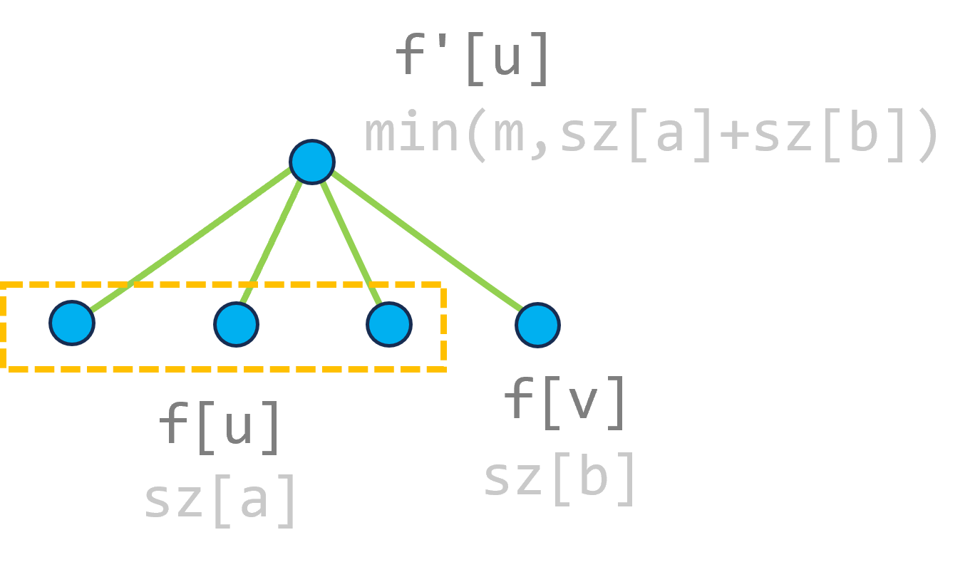 f_{u,j}=\max_{j_1+j_2=j,\ j_1\le sz[u],\ j_2\le sz[v]}\{f_{u,j_1}+f_{v,j_2}\},\quad j\le m