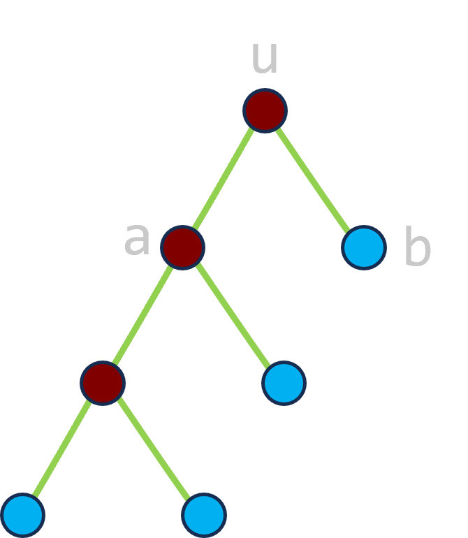 - 对于 \(sz[a]+sz[b]<m\) 的情况,不断向上跳祖先,找到最靠上的满足 \(sz<m\) 的祖先 \(p\);\(p\) 子树内部的时间消耗为 \(O(sz[p]^2)\),这部分时间消耗在 \(p\) 参与的下一次合并中被作为常数去掉了;