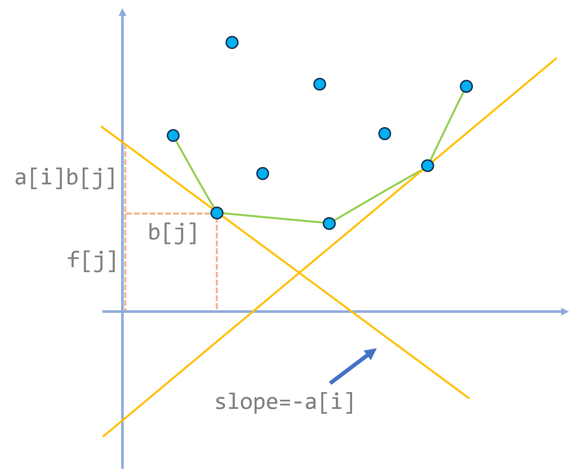我们可以将每个 \(j<i\) 都看作一个点 \((b[j],f[j]+c_1[j])\),转移的过程就是拿一条斜率为 \(-a[i]\) 的直线去切这些点。使截距最小化的节点就是最优决策点。