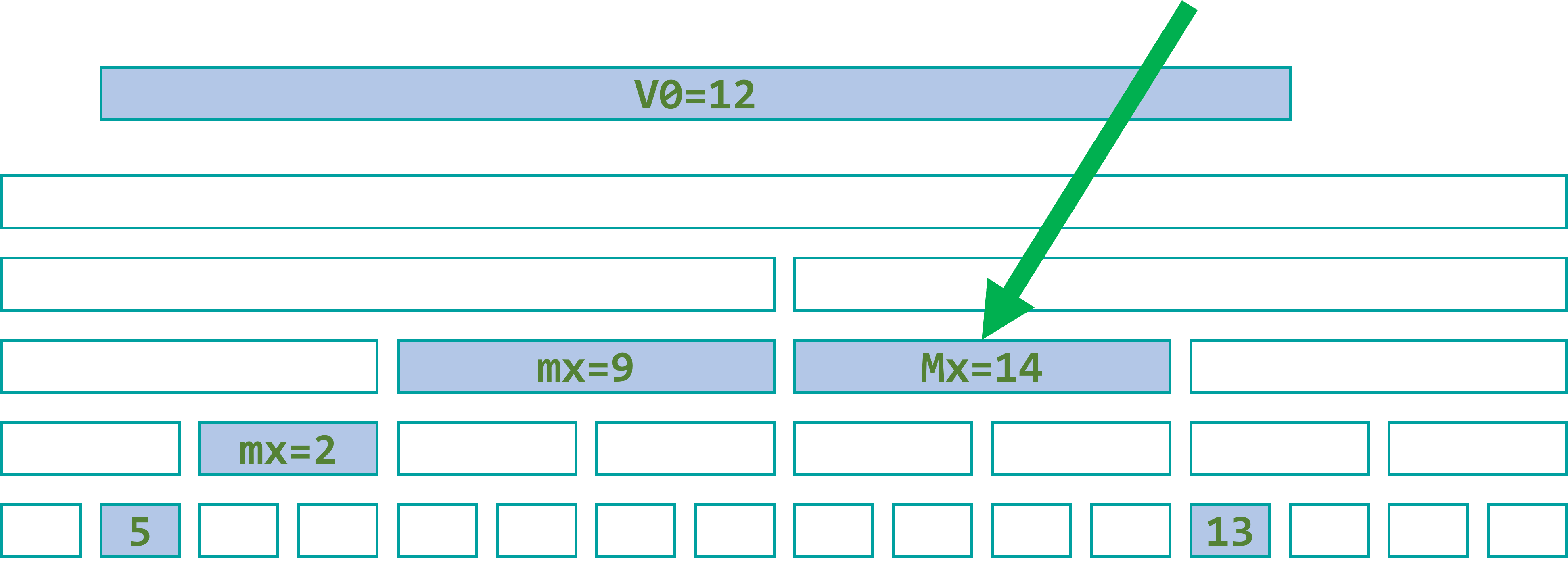 但是如果查询区间不是 \([1,n]\),而是任意区间 \([l,r]\),我们就可以把 \([l,r]\) 拆成 \(O(\log n)\) 段线段树上的区间,按从左向右的顺序依次遍历所有区间,找到第一个 \(mx[p]\ge v_0\) 的区间: